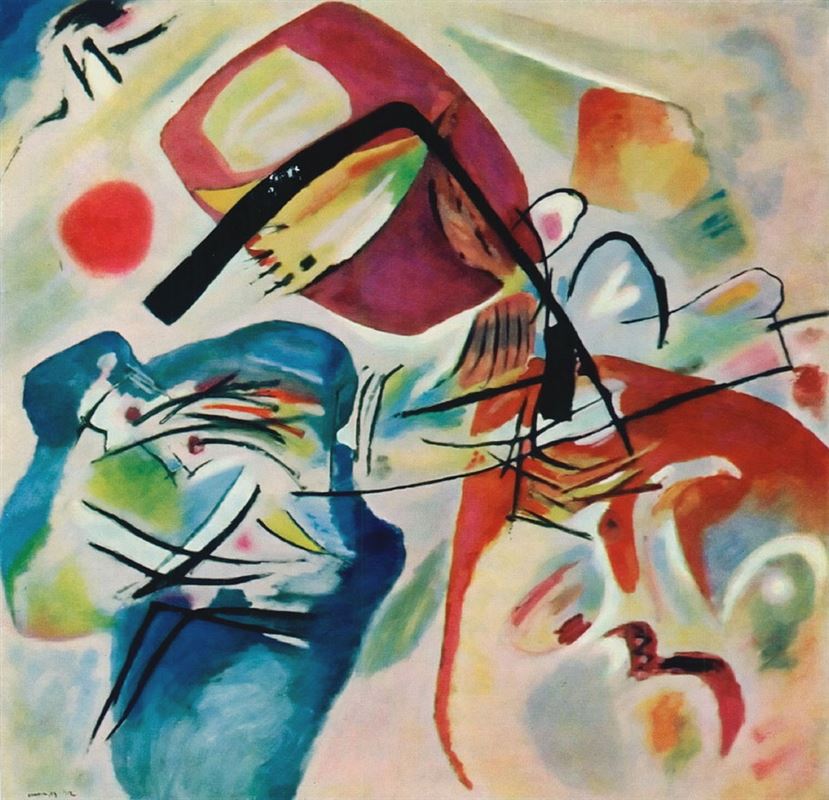 Как уже было сказано, в искусстве Кандинского русская составляющая, сказка, сливается с европейской традицией. Он пришел к абстракционизму через осмысление европейских художественных течений: импрессионизма, реализма и экспрессионизма. Если посмотреть на развитие его творчества, мы заметим медленный, постепенный отказ от объектов и переход к абстрактным фигурам. В наиболее зрелые годы, когда Кандинский преподавал в «Баухаусе» и в парижский период, его произведения ограничиваются набором линий и точек, в которых с трудом можно распознать изображаемый художником предмет. По утверждению самого Кандинского, его абстрактная живопись — не плод идей, порожденных его воображением, или попыток отказаться от материальности объекта в пользу «духовной стороны» вещей, а воплощенное стремление представить объект в его сущности. Скажем иначе, несколько парадоксальным образом: Кандинский изображает сущность предмета, достигая его «предметности» через устранение самого предмета.